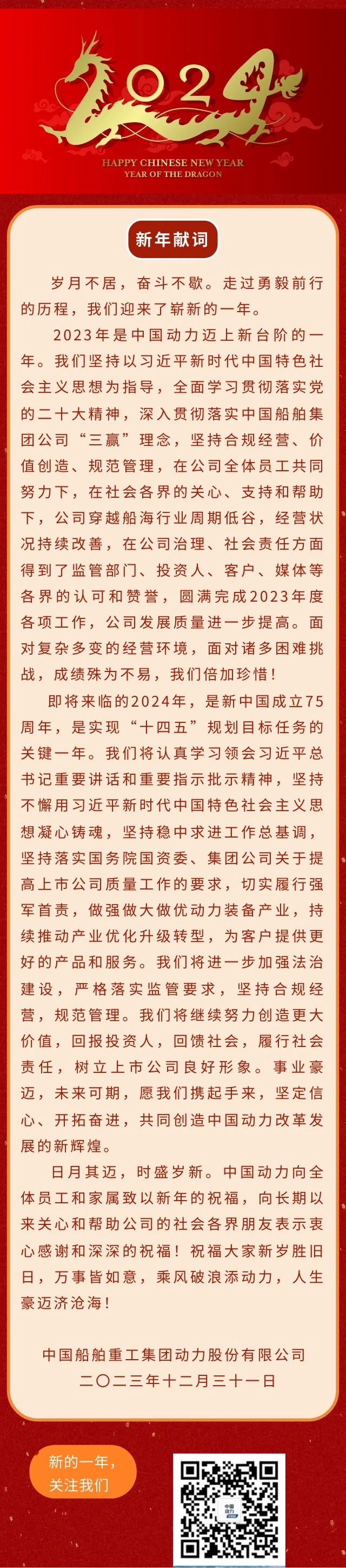 中國船舶重工集團動力股份有限公司2024年新年獻詞