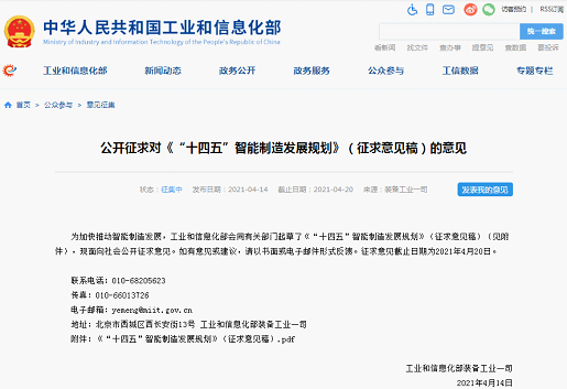 為加快推動智能制造發展,工業和信息化部會同有關部門起草了《“十四五”智能制造發展規劃》(征求意見稿)(見附件),面向社會公開征求意見。征求意見截止日期為2021420日。