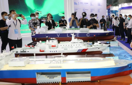 在展示遼寧艦、常規動力潛艇、驅逐艦等產品的海洋防務裝備展示區附近,閃光燈不斷,與會觀眾紛紛駐足,觀看、留影。在高端船海裝備展示區,135500總噸大型郵輪、17.4萬方LNG運輸船、23000箱雙燃料集裝箱船、21萬噸雙燃料散貨船等系列化主力船型和全球領先的船海產品,同樣讓與會觀眾驚嘆不已。